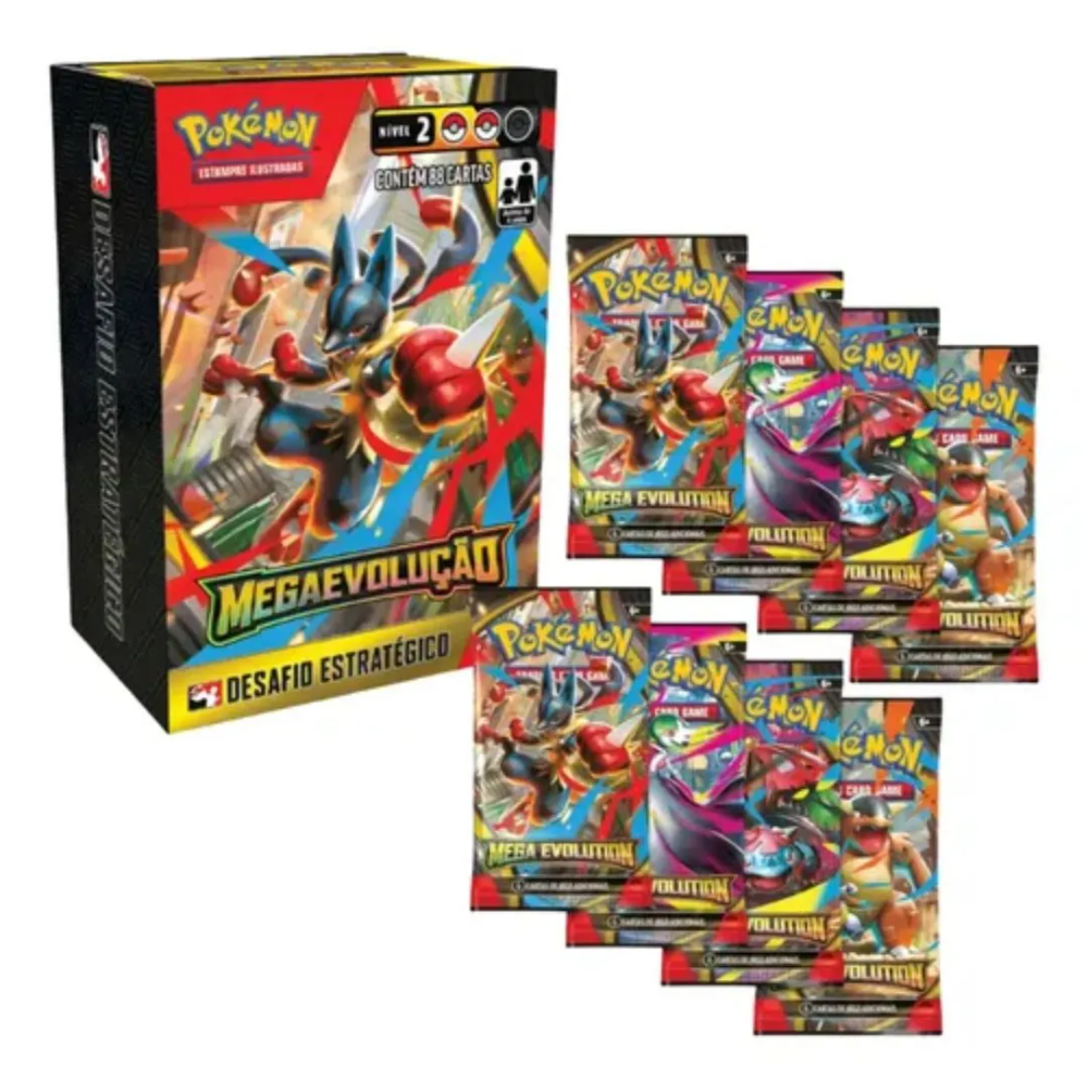Oito pacotes de booster lacrados que aumentam suas chances de encontrar cartas ex, foil ou variações raras da série Megaevolução